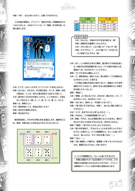 幽霊、妖怪、悪魔、モンスター、その他「人に害をなす得体の知れない何か」。Re:WRITEの世界観において欠かせない立ち位置を占める『怪奇』をコンセプトに、一本のシナリオとそのシナリオを実際に遊んでみたリプレイ、更に追加で二本の簡易シナリオにコラムまで付属。リプレイは丁寧なルール解説付きで、Re:WRITEのルールを把握するのにぴったりな読み物です。